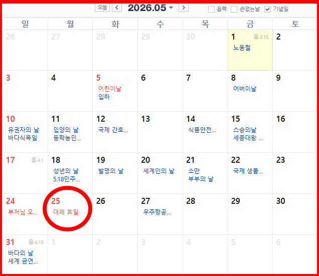 - 5월 24일(일, 부처님오신날) → 5월 25일(월) 대체공휴일