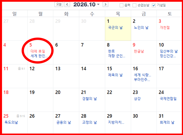 - 10월 3일(토, 개천절) → 10월 5일(월) 대체공휴일