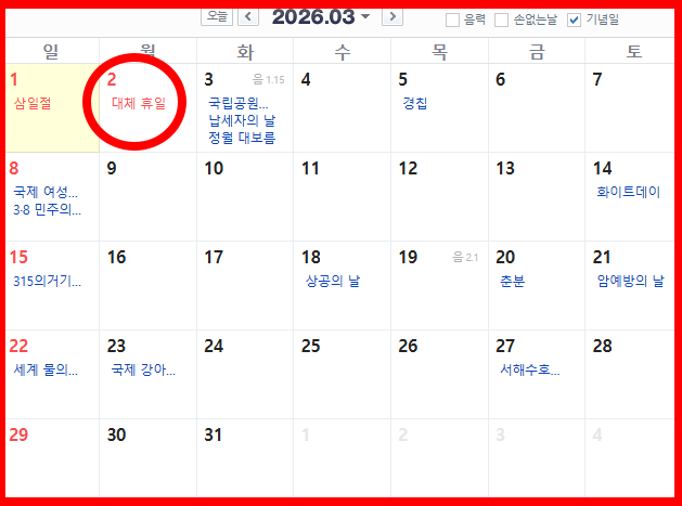 - 3월 1일(일) → 3월 2일(월) 대체공휴일